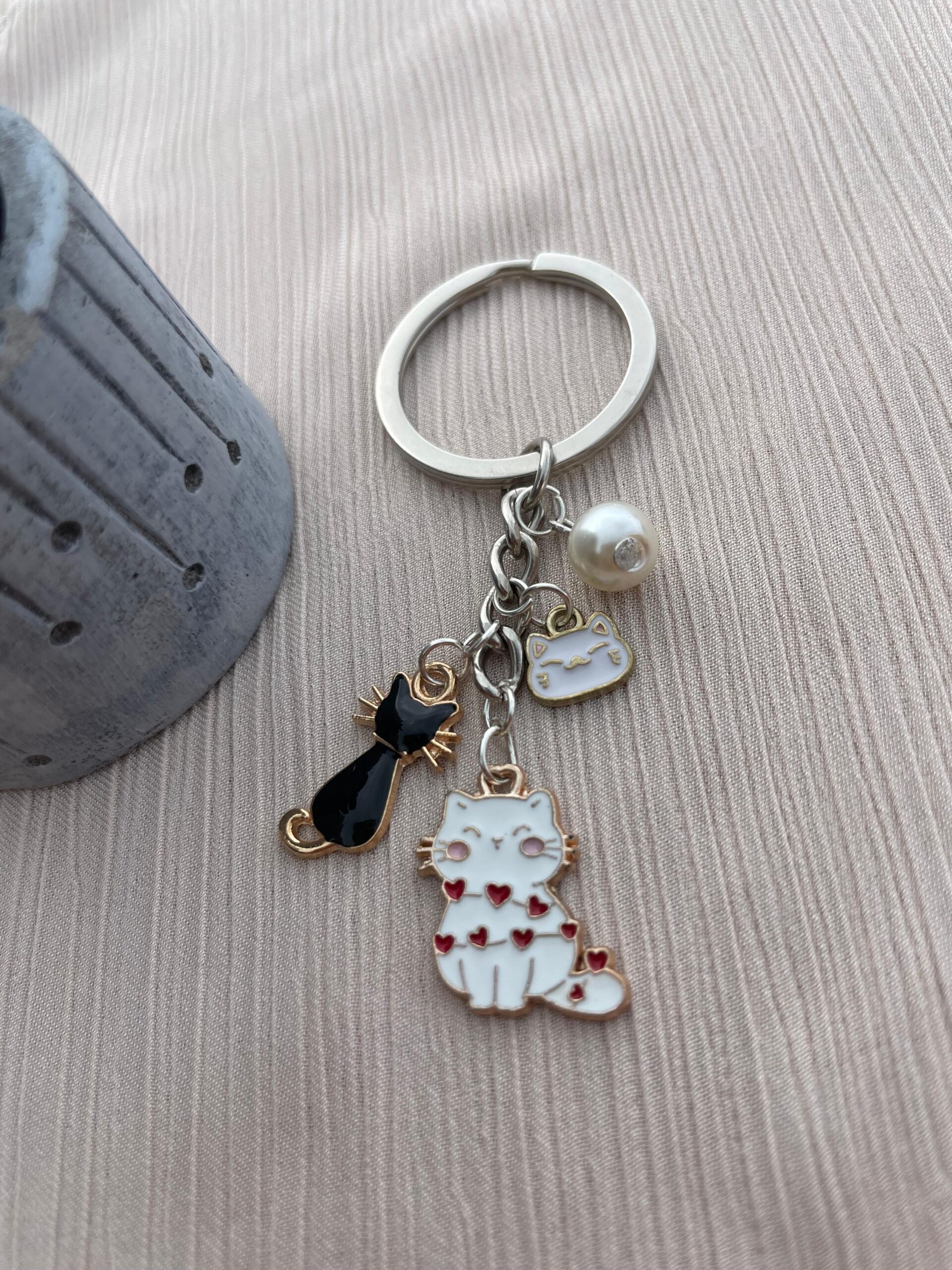 Featuring a white kitty with red hearts, a sleek black cat, and a dainty pearl charm, it’s full of personality.