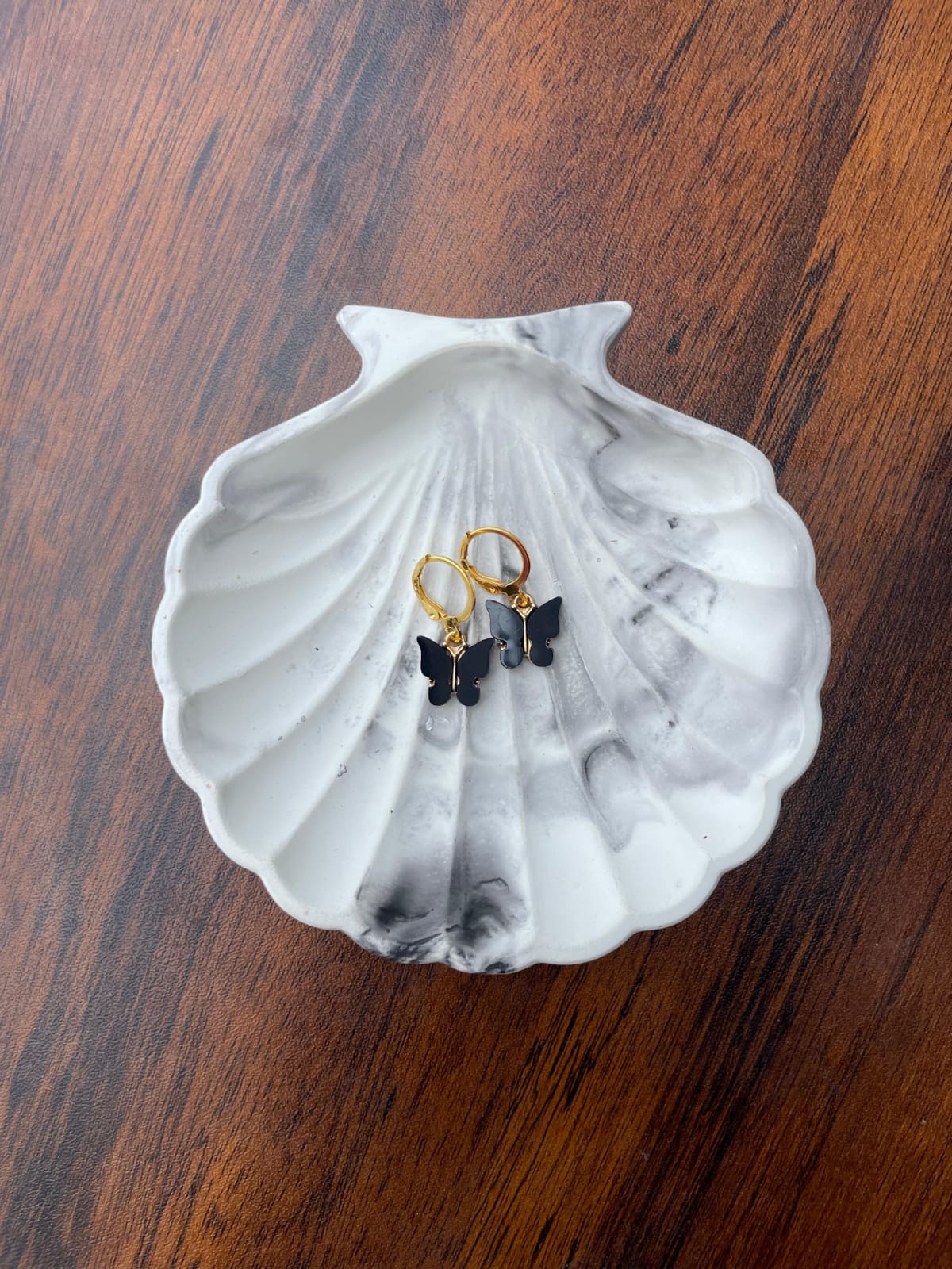 Sleek black butterfly charms dangle gracefully from golden hoops, creating a striking contrast.
