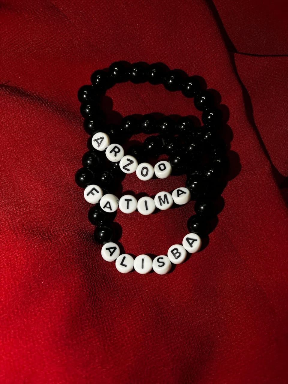 Black beads and bold names for the ultimate aesthetic. Personalized jewelry that matches our shared energy. Keeping our circle tight and our style even tighter. The perfect stack for the perfect trio.