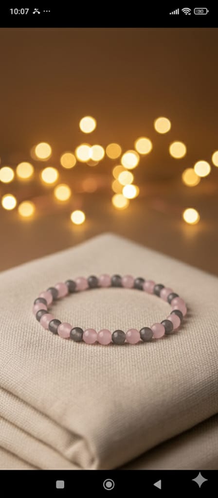 That’s a beautiful bracelet! The beads appear to be Rose Quartz (the soft pink) and Hematite (the metallic grey), which have wonderful meanings perfect for branding.
