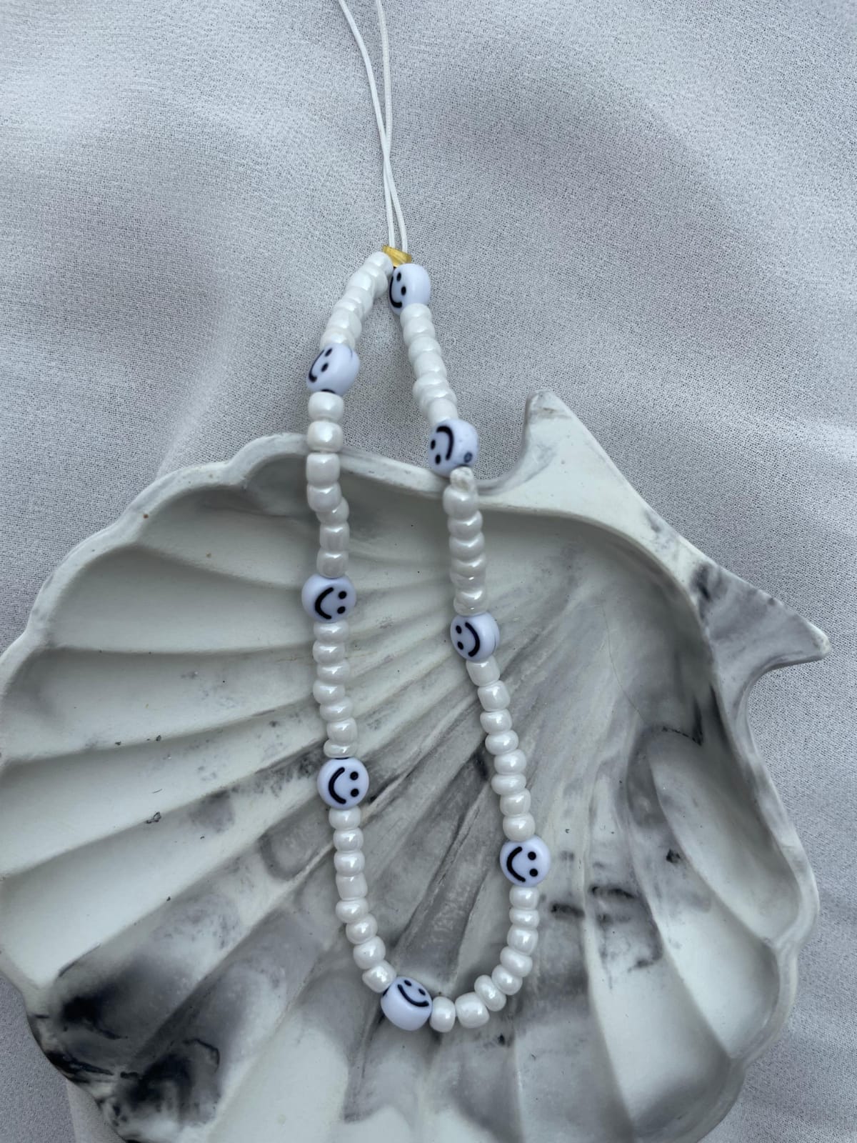 White beads with smiley charms — a fun phone accessory full of positive vibes.